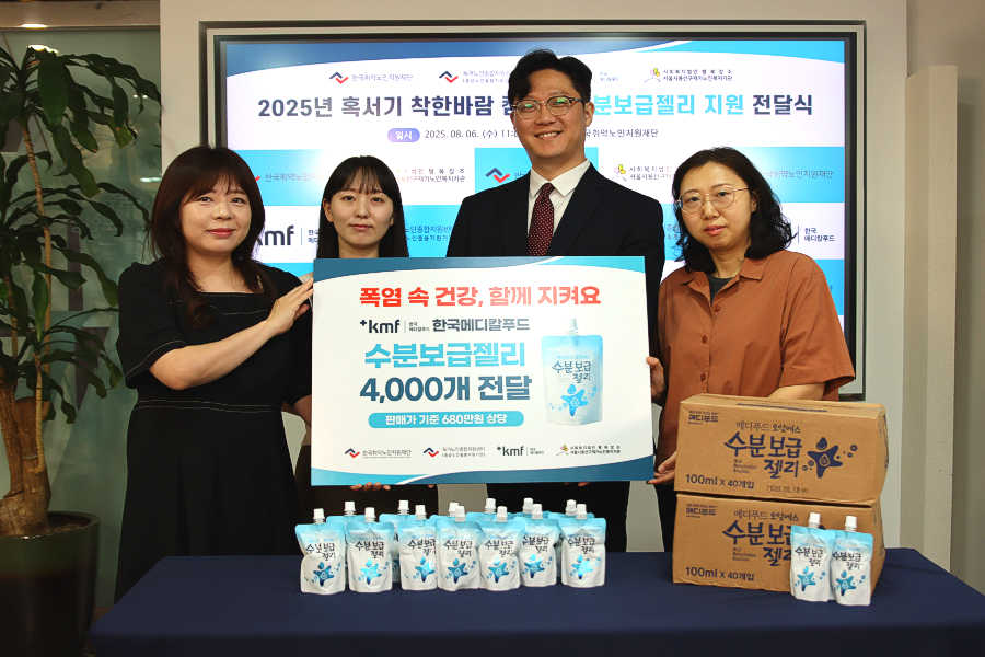 지난 8월 6일, 한국취약노인지원재단은 한국메디칼푸드와 함께 「2025년 혹서기 착한바람 캠페인」의 일환으로 수분보급젤리 물품후원 전달식을 진행하였습니다.